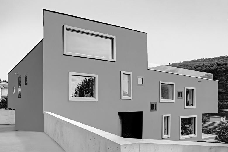 Das Doppelhaus mit seiner unkonventionellen Raumstruktur basiert auf einem Parallelogramm-Grundriss und überzeugt durch eine skulpturale, beschnittene Kubatur. Die unterschiedlich strukturierten und farbigen Putzflächen sowie die kastenförmigen Fenster verleihen dem Gebäude einen verspielten, individuellen Charakter. Vier prägnante Einschnitte gliedern den Baukörper und erfüllen praktische Anforderungen, wie die Zufahrt im Norden und den Durchgang zum gemeinsamen Garten. Innen wurden zwei kontrastierende Wohnkonzepte umgesetzt: Während die talseitige Einheit mit einer geschwungenen Treppe entlang der Trennwand beeindruckt, organisiert sich die Hangwohnung um einen dynamischen Treppenkern. Beide Konzepte verbinden funktionale Erschliessung mit einem spannenden Raumgefühl und bieten den Bewohnern jeweils individuelle Wohn- und Gemeinschaftsbereiche, die optimal auf ihre Bedürfnisse abgestimmt sind.