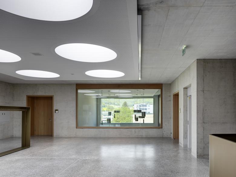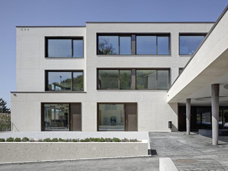 Dorfseitig erreicht man das Sockelgeschoss des Neubaus, in welchem die Naturkundezimmer und rückwärtige Nebenräume angeordnet sind. Eine skulptural angelegte Treppe führt den Besucher in die Eingangshalle des Erdgeschosses. Hier sind mit dem Lehrer- bzw. dem Mehrzweckraum die Nutzungen mit dem höchsten Öffentlichkeitsgrad angelegt. In den zwei Obergeschossen sind jeweils vier gleichmässig ausgerichtete Klassenzimmer mit Gruppenräumen angeordnet. Sie werden aus einer inneren, zentrischen Halle erschlossen und profitieren von einer über Eck organisierten natürlichen Belichtung und Aussicht. Die Klassenzimmer lassen sich über interne Verbindungstüren zu einem Klassenverband zusammenschliessen. Teilweise doppelgeschossige Pausenräume ermöglichen Aus- und Einsichten und schaffen innerhalb des kompakten Bauvolumens eine Vielfalt an räumlichen Bezügen. Die Lektüre des Ortes hat die Ausformulierung des architektonischen Ausdruckes und die Wahl der Fassadenmaterialisierung massgeblich beeinflusst. Die Fassaden aus gestocktem und schalungsglattem Kalksteinbeton wie auch die Lochfenster lassen eine Verwandtschaft mit dem Bestand erkennen. Die Wahl des Betons als Fassadenmaterial ermöglicht ein monolithisches Herauswachsen der Gebäudekubatur aus dem ansteigenden Terrain.