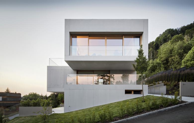 Das Baugrundstück der Bauherrin ist einer dieser Orte. Der See im Südosten und am Hang gelegen sind fürs Wohnen in dieser Stadt von kaum überbietbarer Qualität. Der Umgang damit prägt die Architektur, leitete den Entwurf. Der weite Blick über den Bodensee, Sonnenauf- und -untergänge verlangen ein entsprechendes Verhältnis zwischen Innen und Außen und eine darauf abgestimmte Organisation des Hauses. Die skulpturale Ausformung des Volumens ermöglicht den Zugriff aller Wohn- und Arbeitsräume auf die Sicht zum See. Die Schicht der Nebenräume bilden den Rücken zum Hang, die Inszenierung der Erschließung verknüpft die Funktionen mit den beschriebenen Lagequalitäten. Weg und Aussichten erzeugen die Spannung die der Situation entsprechen. Um dem Narrativ des Hauses gerecht zu werden, war der minimalistische, sehr präzise Umgang mit allen Details wichtig. Der gebaute Raum ist an jeder Stelle sichtbar. Das Leben um und im Haus ist das Leben am Bodensee.