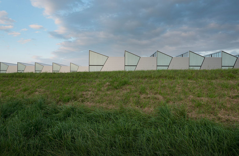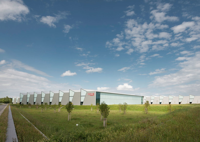 Unterstützt wird die Auflösung des großen Bauvolumens durch die Topographie der Shed-Dächer, die den Produktionshallen eine rhythmisch bewegte Silhouette verleihen. Ihre Geometrie setzt sich in den Fassaden aus polygonal zugeschnittenen Feldern aus Trapezblech, Glas und transluzentem Profilbauglas mit einer umlaufenden Gesamtlänge von 1,8 Kilometern fort.