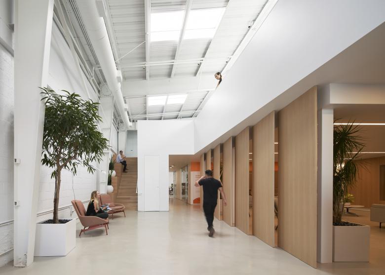 The main design gesture turns the previous unused exterior patio into a large, outdoor garden, which gets pulled through the workspace into the central courtyard on the second floor. The open-air enclosure filters light and greenery into previously dark, isolated spaces and offers a moment of reprieve from the industrious energy throughout.