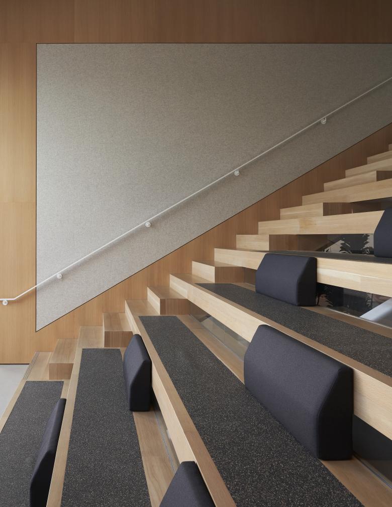 The featured entry stair functions as a workspace that transitions into a large stadium seating for company-wide events, meditation, presentations, all hands meetings, or flexible working space. A media screen rolls down in front of the large bi-fold door and a large suspended curtain folds around to control light and sound. True to Headspace’s brand philosophy, free standing meditation pods and quiet meditation areas are available throughout the space to allow employees additional moments of solitude.