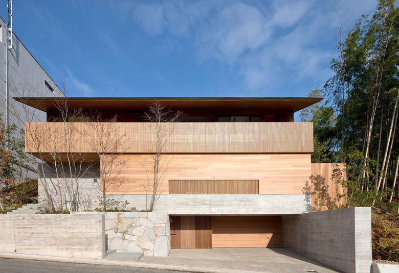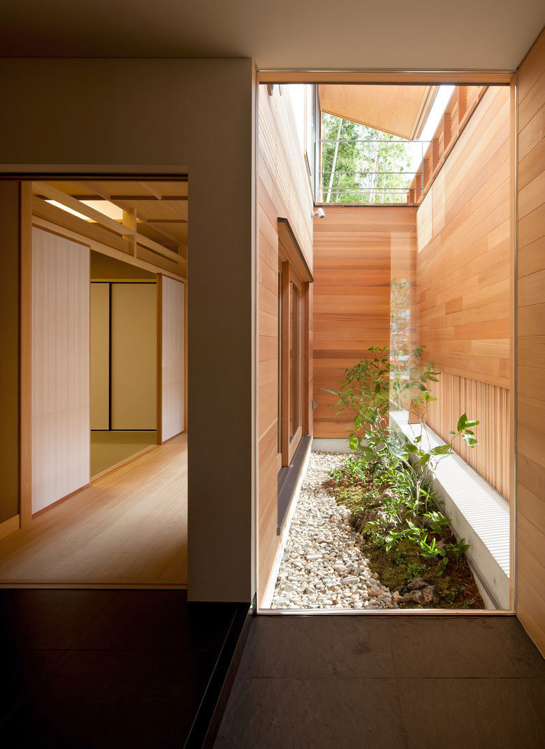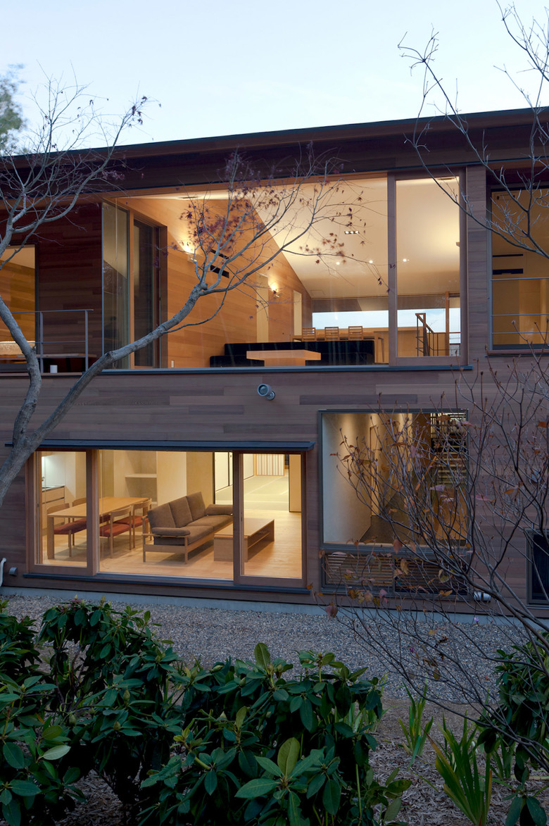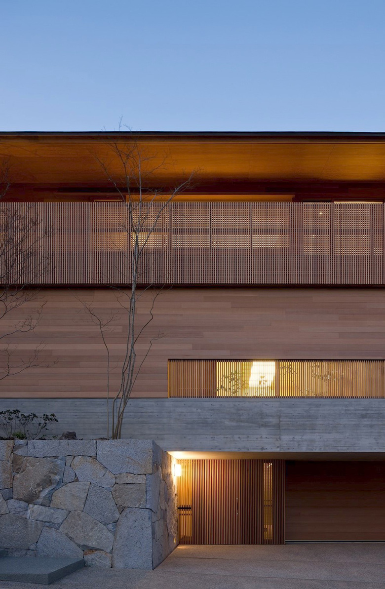 特に南面には深い庇と格子状手摺を配し、採光通風を得つつ、道路からの視線を制御する陰影ゾーンとつくっている。さらに趣きある樹木は人をやさしく迎え、全体に深みのある和の佇まいをつくりだした。