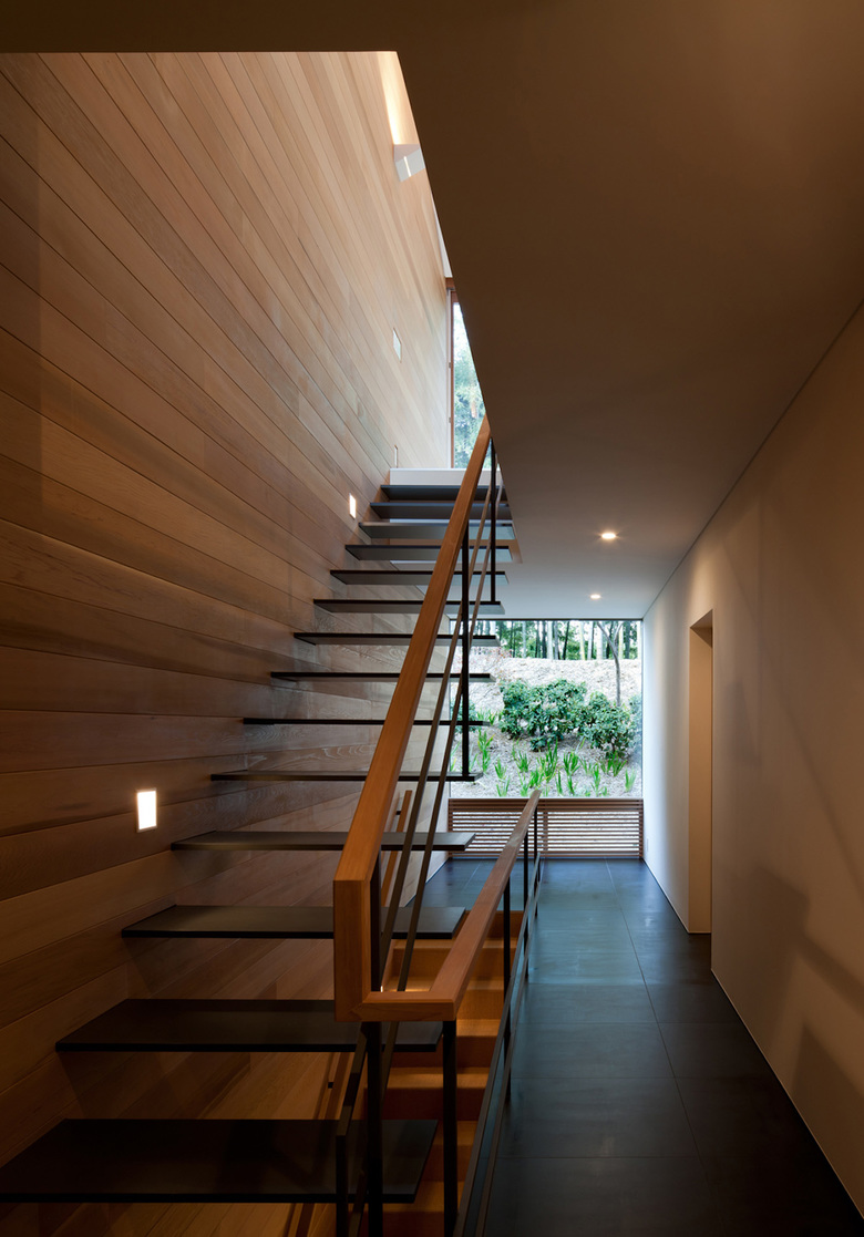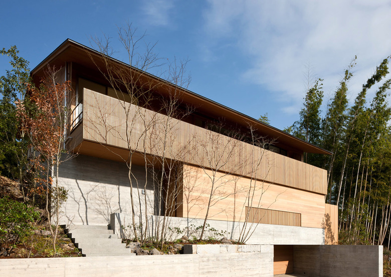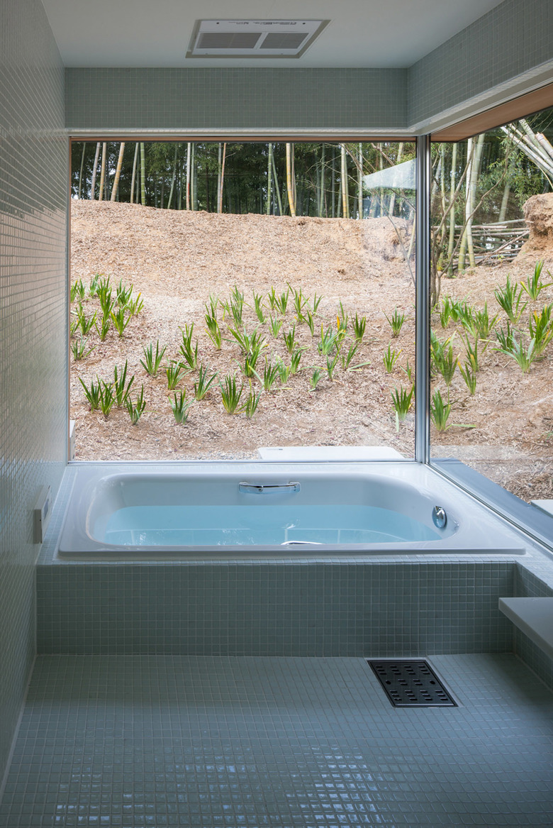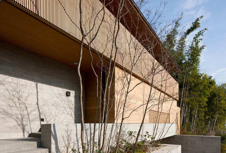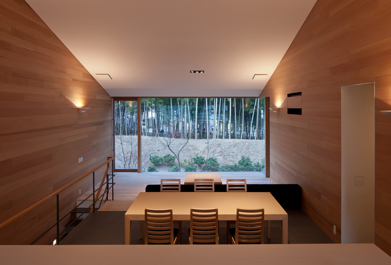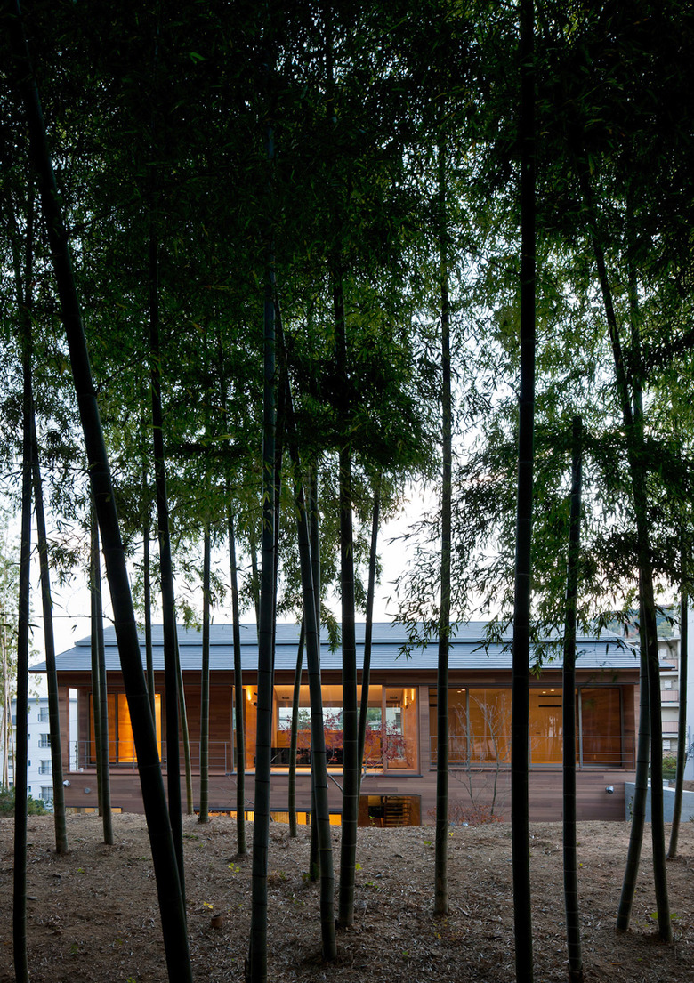 またタケノコの産地としても知られ、通りには美しい竹林が随所に広がっていた。本計画地はそのような広大な竹林の南側に位置し、北側には竹林の庭を設けることとなった。外観は竹林のもつ和の風情や自然のうつろいが背景となじむ様、外壁を板張りとしその表情を醸し出している。部分的に木格子・RCスギ板打放し仕上げを配し、内部にやわらかい光の場を生み出している。