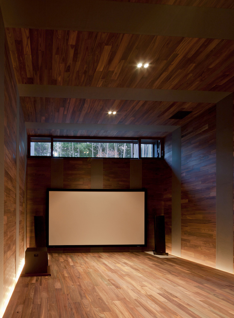 地下1階は竹林の高低差を利用してガレージと、ご家族の趣味であるシアタールームを配し、本格的な石井式シアタールームとした。その室の高窓からは北側の竹林も楽しめ、まるで劇場にいるかのようだ。