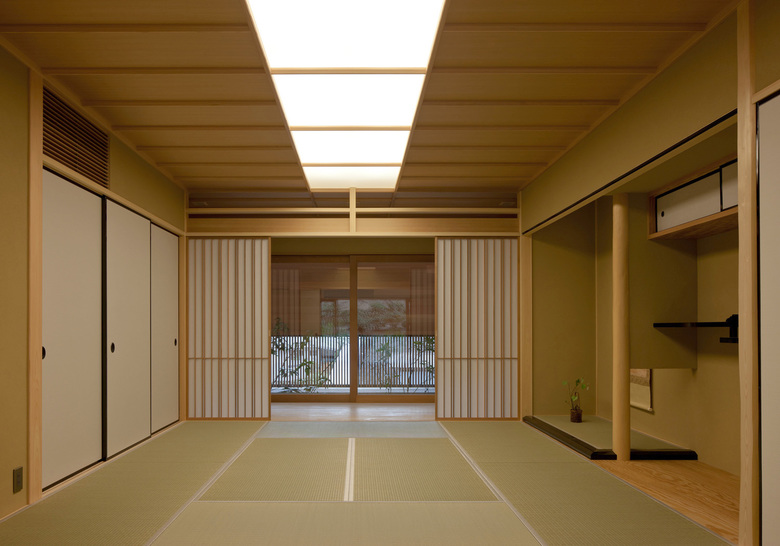 内部は2世帯住宅となっており、1階は主に祖父母の居住スペースとなっている。中央には南から中庭・和室・LDK・竹林へと連続し、和室は床の間・床脇・仏間を配した行の構えとし、書院風の設えとしている。