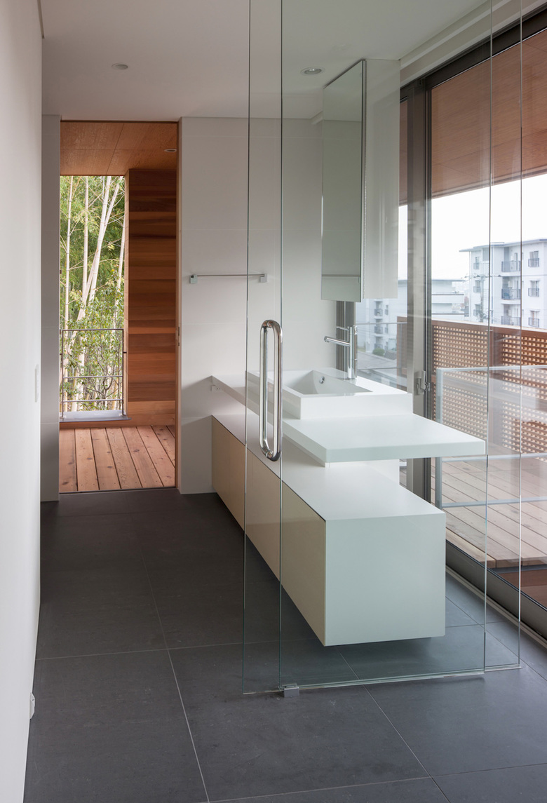 2階はご夫婦家族のスペースとなっている。こちらも日差しの入る深い軒のデッキからK・D・Lが連続しており、視線が北側竹林への向かい、南北を開放し陰と陽の場を生活の中で体験する。