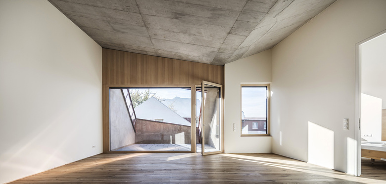 Umso schwieriger das Grundstück, desto kreativer die Lösung. Das nennt man eine Herausforderung. Nicht die einzige. Eine andere, als Vorgabe der Stadt formuliert: Umsetzung einer modernen Interpretation eines Satteldachs als unmittelbarer Typologiebezug zur Architektur der Nachbarschaft. So gesehen wird das Satteldach in verschiedenen Schnittformen zum Maßstab - für die Baukörperteilung und für die Wohnungsaufteilung. Die individuelle Gestaltungsfreiheit bekommt in den 13 Wohneinheiten in der Wohnanlage mehr Spielraum für eine höhere Wohnqualität. Zu den unverrückbaren Fixpunkten der Wohnanlage zählen Kochnische und Bad, alles andere ist für Wünsche der Bewohner noch offen. Das variantenreiche Spiel mit den Fenstern und deren überraschende Anordnung werden zu einem Merkmal des dreigeschossigen Gebäudes. Die Fassade ist Sichtbeton, der eine leichte Farblasur erhält, die die Betonstruktur durchschimmern lässt – Schutz und Farbakzent zugleich.