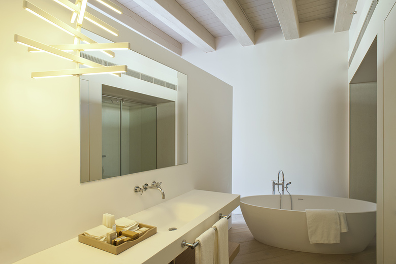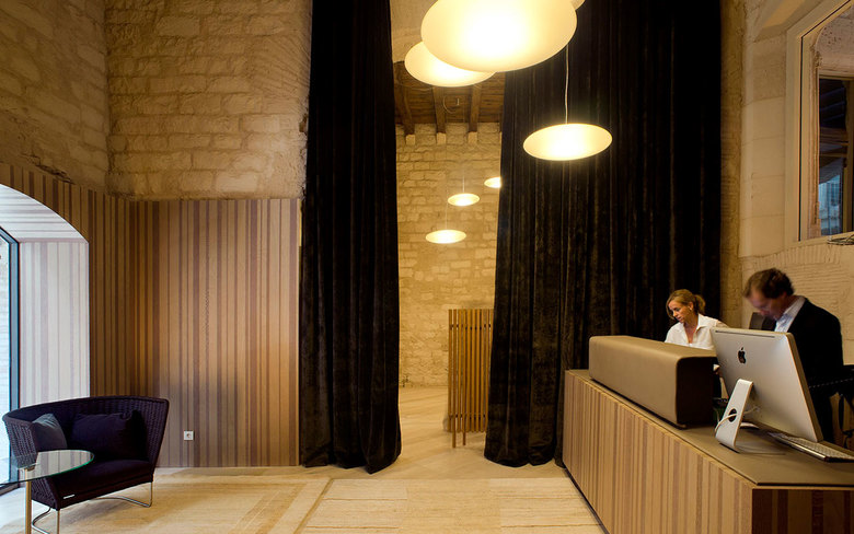 The interior design is modern and fresh, but at the same time subdued and respectful of its setting. On every occasion we took the building's historical elements and idiosyncrasies, its corbels and its arches, as hidden treasures and design opportunities. As a result, every room is unique, as the overlay of the new design lets the spatial qualities of the older construction read through. The hotel's high standard of finish and level of amenity complement the genuine antique roughness of the structure.
