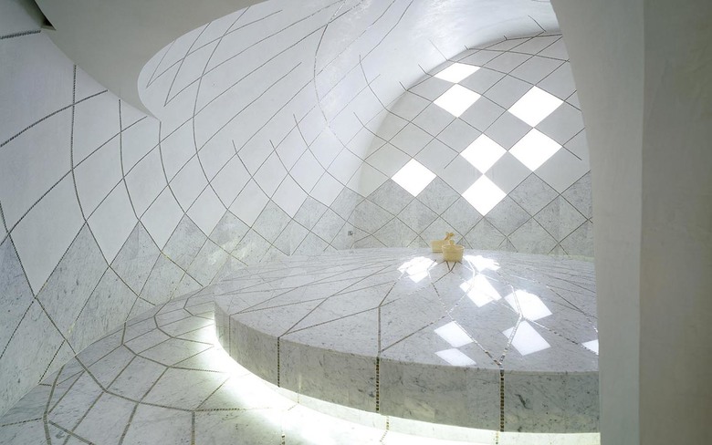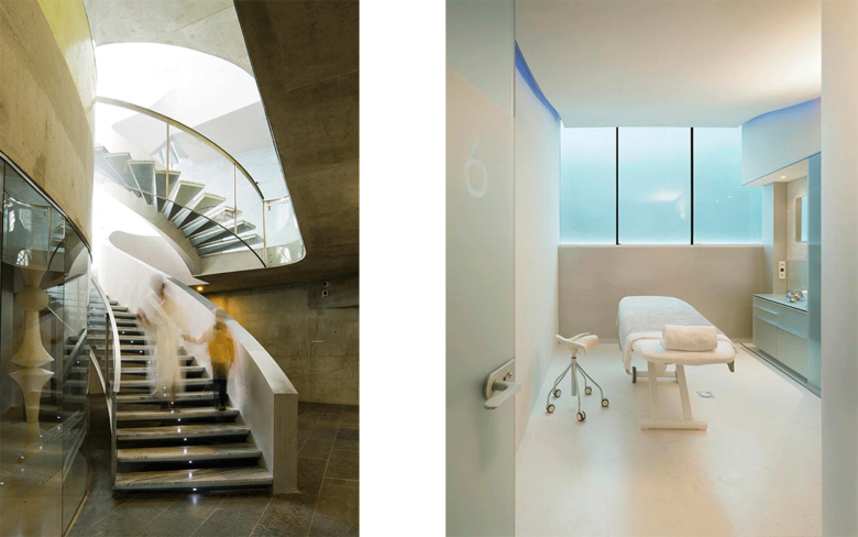 The program is complex, and the municipal zoning limits require that much of the floor area be located underground, making the provision of natural light and views of the surroundings to the maximum area of the plan a design priority. The carving out of the building volume and the strategic location of windows serve to connect the interior spaces with the mountain landscape, giving the visitor a series of orientating cues and embracing him in an atmosphere of wellness and serenity. On the other hand, the overlapping ribbons envelop and blend the spaces as they weave through the interior. On the main level are the pools and saunas, with one exterior and three interior hot pools, Turkish baths, cold baths, ice baths, saunas, showers, foot baths, relaxing areas, and juice bars.