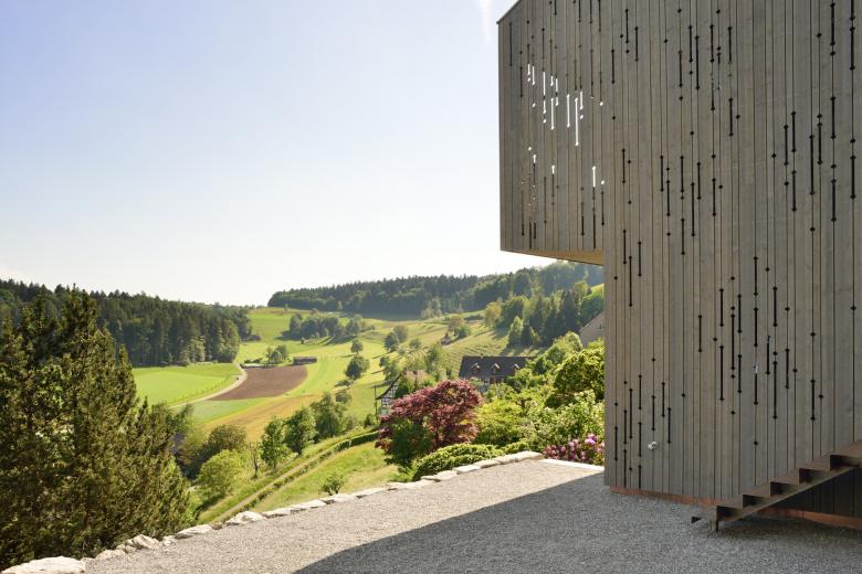 In der Fassade wird der Kontrast zwischen Alt und Neu klar aufgezeigt. Wie eine Haut legt sich die neue Fassade aus vorvergrauter Fichte um den Winkel der geschützten Fachwerkfassaden und zeichnet das historische Volumen des Gebäudes nach. Ein Kamin zur Lichtführung in das Dachgeschoss, ein auskragende Erker und Schiebetore interpretieren ortstypische Elemente neu und gliedern die Aussenhaut. Wie in der ländlichen Baukultur stark verbreitet wurde die halbtransparente Holzverschalung mit regionalen Ornamenten versehen, die in unregelmäßigen Verdichtungen ausgefräst wurden. Die neue Fassade löst sich auf in ein zartes Kleid, das dem Innen- und Aussenraum ein feinsinniges Licht- und Schattenspiel bietet.