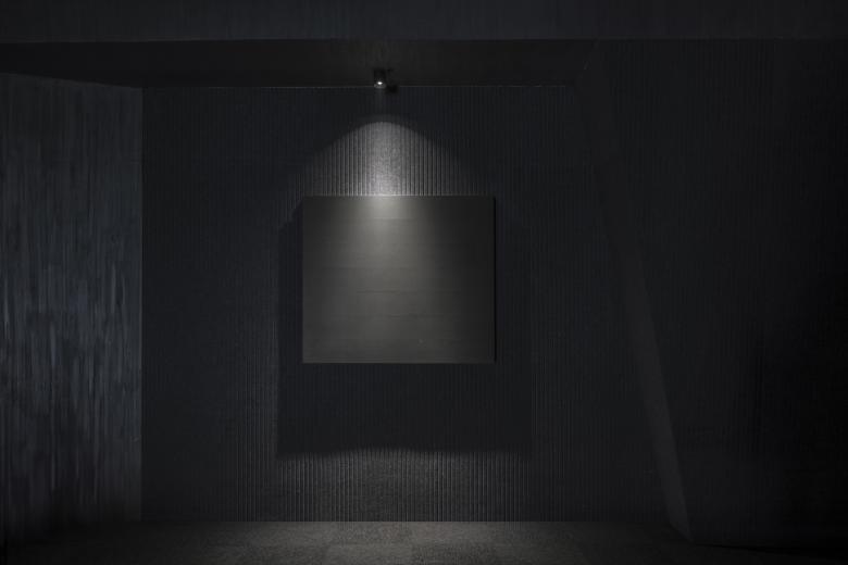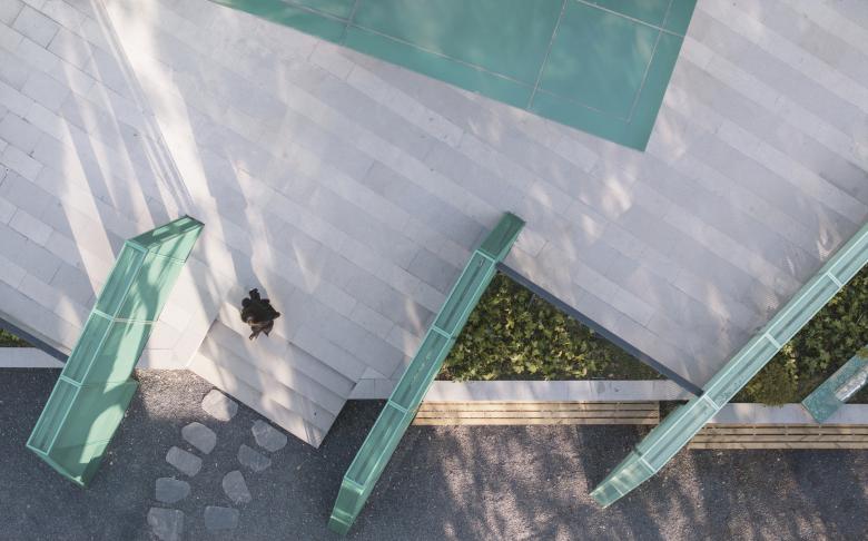 Outside, the landscape is rendered in verdant hues, evoking classical green-blue Shan Shui paintings, while the interior transforms into monochrome landscapes, embodying serene simplicity. Inspired by the "cún" (皴) brushstrokes of Chinese ink painting, the design incorporates acoustic panels and artistic coatings to create rich vertical textures. A mezzanine level echoes the inclined walls of the ground floor, immersing visitors in an experience reminiscent of venturing deep into the mountains.