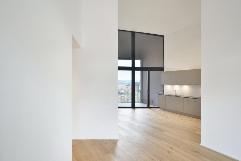 Im Inneren überzeugen die Wohnungen durch klare Grundrisse, grosszügige Raumhöhen und differenzierte Aussenbezüge. Loggien und raumhohe Verglasungen schaffen fliessende Übergänge zwischen innen und aussen. Die Dachwohnungen mit über fünf Metern Raumhöhe entfalten eine skulpturale Raumwirkung, getragen von der expressiven Dachlandschaft.