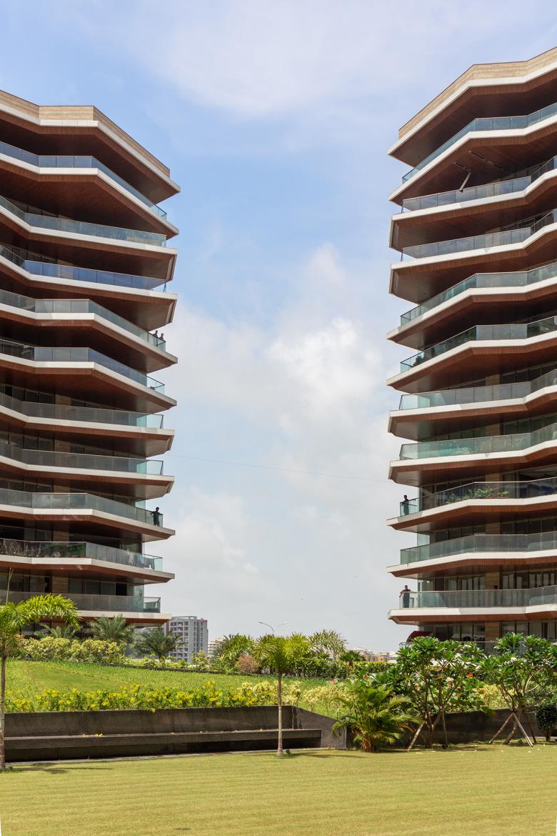 Located on a plot of 29,600 sqm in Surat city, India, with a height limitation of 40 metres, the buildings are laid out along the site perimeter creating a large focal garden of 13,000 sqm.