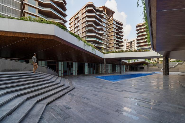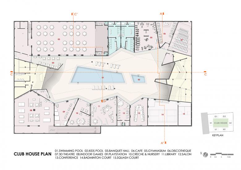 The large landscaped area rises in angular planes revealing a partially sub-terranean recreational club with entertainment & sports facilities that are sheltered from heat gain & simultaneously open to natural ventilation & light.
