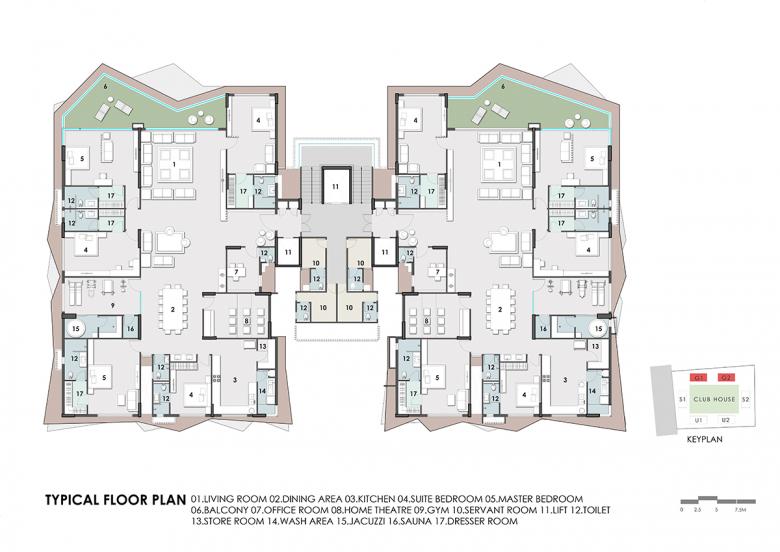 In response to a very specific brief, this housing project has 126 apartments in six buildings of 11 storeys each. Planned in three different sizes these apartments of 750, 850 & 950 sqm are configured with large living spaces, 5 bedrooms, a study & a gym in them.