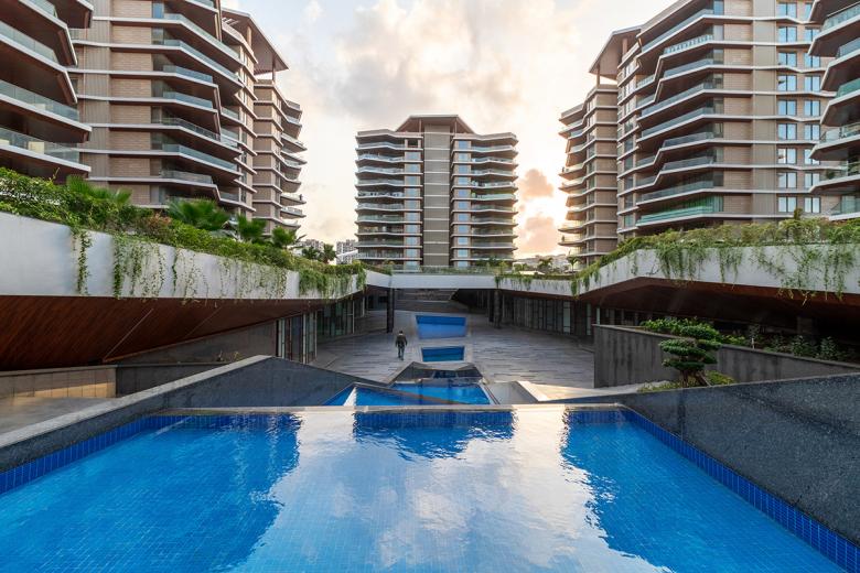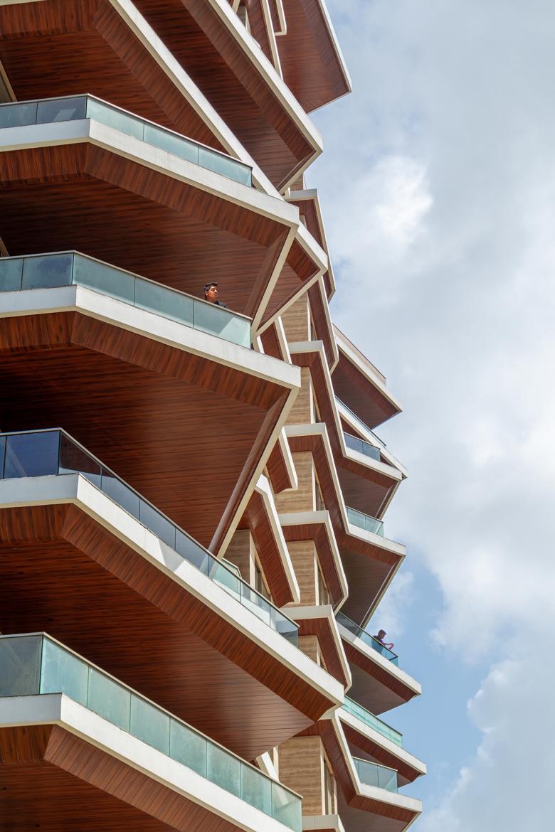 The extensive landscaping with trees, plants, and water bodies helps in passive cooling. The large overhangs & outdoor decks to each apartment reduce heat gain whilst adding individual outdoor spaces.