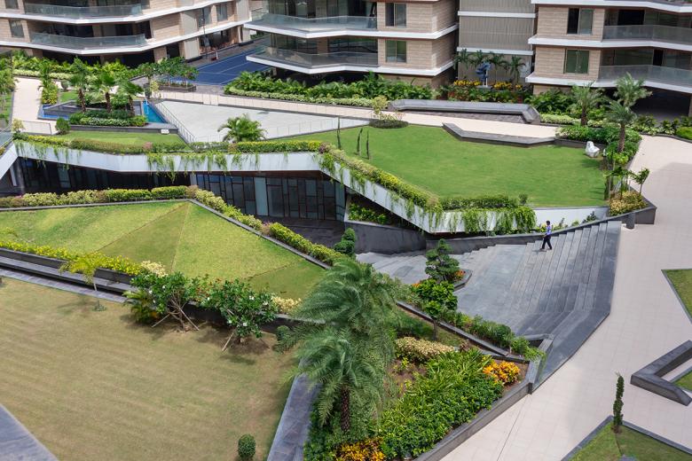 Water recycling, rain-water harvesting, sewage treatment & solar panels contribute towards reducing the carbon footprint & making the project self-sufficient.
