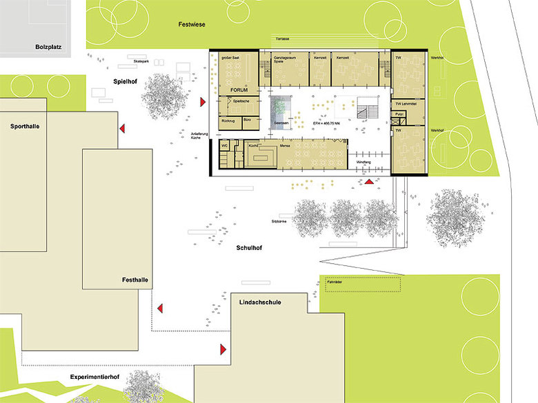 Eine zentrale Position nimmt die Aula ein, die über einen Innenhof sowie über eine große Deckenöffnung natürlich belichtet wird. Um diese Aula herum gliedern sich die Nutzungen Betreuung, Mensa und Forum. Die Mensa kann zur Aula hin großzügig geöffnet werden. Zum Schulhof hin bietet die Mensa die Möglichkeit auch im Außenbereich zu bestuhlen und ist somit Bindeglied zwischen Außen und Innen.
