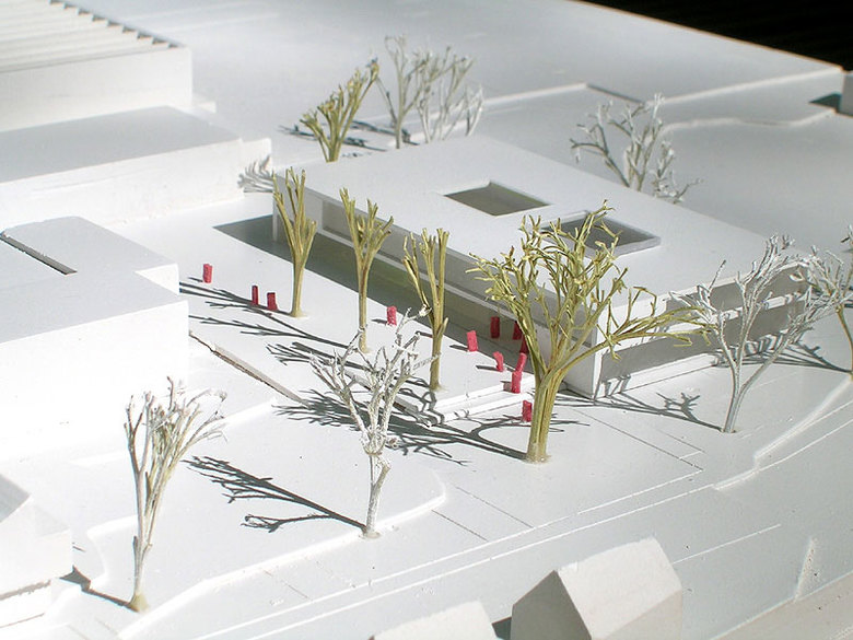 Die Längskante des Gebäudes führt zum Zentrum von Schule und Festhalle. Die Platzräume werden durch diesen Baukörper klar gefasst. Die Freiraumabfolge ergibt spannungsvolle Übergänge. Die Freiflächen sind den Nutzungen richtig zugeordnet. Die Raumnutzungen sind im Grundriss wie in den Ebenen funktional zueinander richtig positioniert.