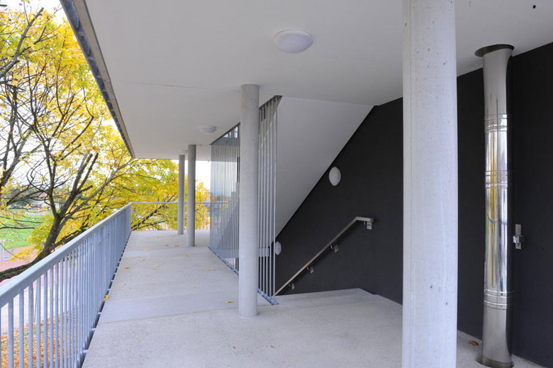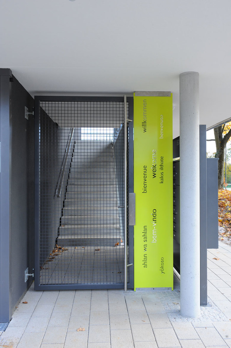 Von der Egilolfstraße ist das Gebäude von der Westseite barrierefrei erreichbar, an der Nord-seite erfolgt der Zugang über eine Außentreppe zur Ebene 0. An den Stirnseiten ist jeweils ein offenes Treppenhaus angeordnet, von denen die ringsumlaufenden Laubengänge erreicht wer-den. Außer der Erschließung können die Laubengänge als Außenbereich für die Appartements genutzt werden. Die Einheiten im Gartengeschoss (Ebene 0) sind auf überdachten Wegen zugänglich.