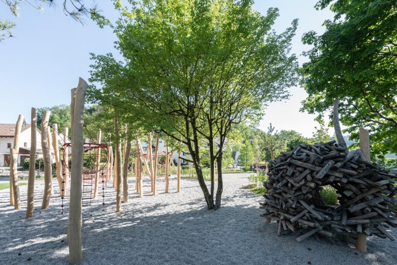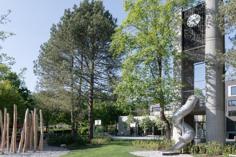 Im Zuge der Schulhaussanierung wird der Aussenraum basierend auf dem wertvollen Baumbestand grundlegend neu programmiert. Unterteilt in den räumlich gefassten Kindergartenaussenbereich mit Bachlauf und Ortbetonterrasse, die offene Schulterrasse mit neu projektierter Schattenpergola und den in den ausgelichteten Baumbestand eingelegten Spiel- und Sportflächen entsteht im grünen Herzen von Bettingen ein generationsübergreifender Ort der Begegnung.