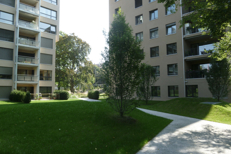 Der Sevogelpark umschliesst die neue Wohnüberbauung wie eine Klammer. Besonderen Wert wurde auf den bestehenden Baumbestand und dessen Unterwuchs mit zahlreichen seltenen heimischen Geophyten gelegt. Sich öffnende und schliessende Wege erschliessen den Park und führen die Bewohner unter das Kronendach der bestehenden Bäume. Die Wege schneiden sich in flache Rasenpyramiden ein. Eine Wasserschale spiegelt die Umgebung wieder, und mit etwas Glück kann der Besucher den badenden Vögeln zuschauen. Eine Blutbuche steht im Zentrum zwischen den beiden Gebäuden und markiert einen weiteren Aufenthaltsort. In Anlehnung an die Parktypologie wurde auf der langen Sichtachse eine Heckenlandschaft aus „tanzenden Eibenstreifen“ gepflanzt. Diese dienen unter anderem auch dem Sichtschutz und der Einteilung der privaten Gartenanteile im Erdgeschoss.