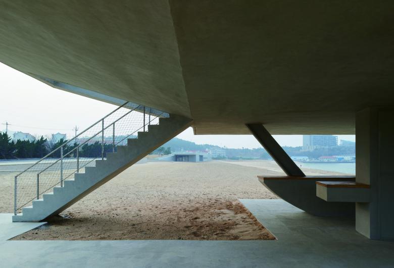 Just like the wings, the cantilevered horizontal plane presents a posture of flying, creating a sense of ambiguity between the building and site. Part of the cantilevered slab is inclined which gives the building an unstable state -as if it has just landed and gazing at the sea, and it seems to be leaving the next moment. The moment of time seems just happened to freeze on the building.