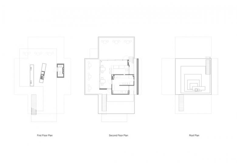 Up to the second floor from a narrow straight flight stairs that running through the cantilevered slab, it comes to an open viewing platform, overlooking the sea to the north and the village to the west. Sliding glass walls are used for a more flexible space. When fully opened, it connects the indoor and outdoor areas, providing a spacious viewing and dining platform for such compact building. The logistics and the stairs to the roof are half-hidden on the inner side of the inclined slab. In minimal plan layout, the service space and served space, visitors circulation and logistics circulation are clearly separated by the slabs that are inclined at different angles.