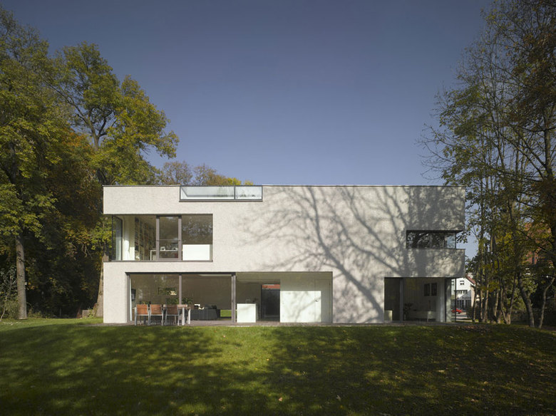 Durch die Behandlung seiner Fassaden fügt sich auch das Haus SL in die Reihe der phänomenologischenWohnhäuser von Titus Bernhard Architekten ein. Zwei Häuser mit unterschiedlicher Charakteristik treffen dabei in einem einzigen Haus zusammen. Um dies zu erreichen, wurden die beiden nördlich gerichteten Fassaden mit einem glatten Putz und kleinen, außenbündigen Fenstern versehen. Komplementär dazu ist die südliche Fassade mit einem rauen Spritzputz und großen Fenstern in tiefen Laibungen ausgebildet.