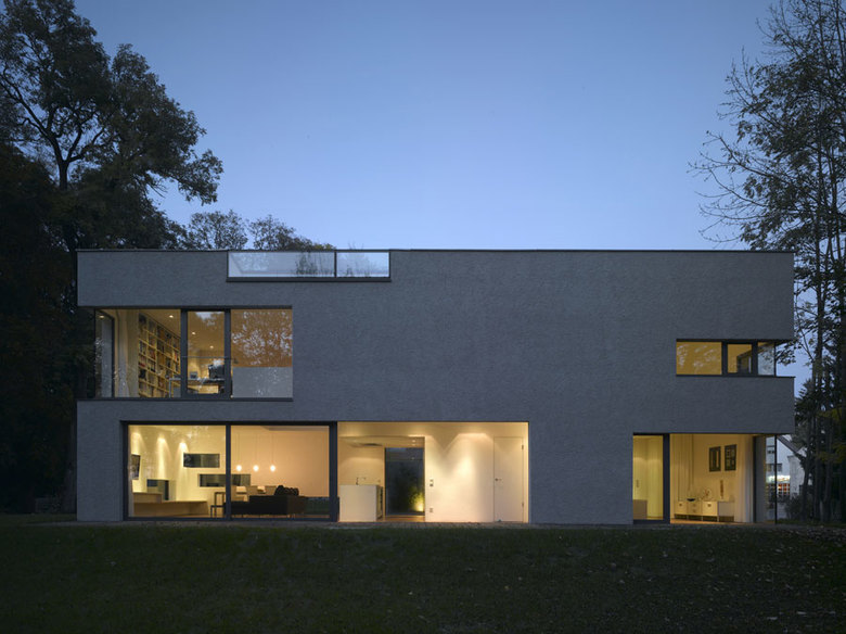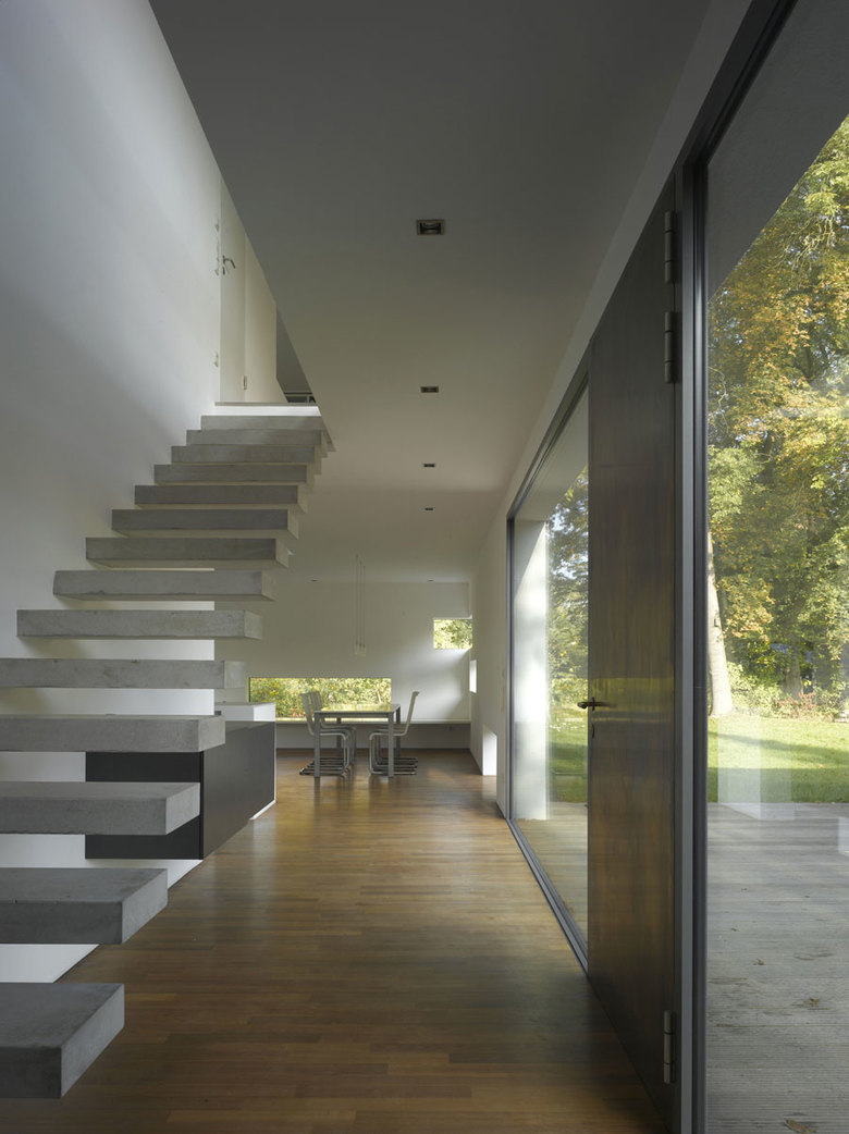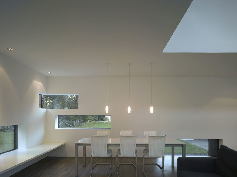 Die horizontalen Formate der Fenster verbinden die beiden Themen wieder. Im Inneren desWohnhauses steht ein installierter Kern, abgelöst von den Außenwänden. Darum herum sind die Hauptnutzungen angeordnet, ein Luftraum verbindet sie miteinander. Durch das Licht- und Schattenspiel sowie die Erlebbarkeit der Tages- und Jahreszeiten ist eine bewohnbare Raumskulptur entstanden.