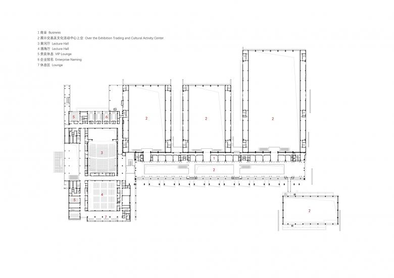 The design, responding to the operational needs of the exhibition building, features a flexible and efficient arrangement that allows for space division and consolidation. The trading center includes a central hall, one 10,000 m2 large exhibition hall, two 5,000 m2 intermediate exhibition halls, one 3,000 m2 small exhibition hall, along with supporting facilities such as convention center. These multiple exhibition spaces are arranged linearly from north to south, connected by the central hall, presenting an efficient herringbone layout. Interconnecting corridors are arranged between the individual exhibition halls, allowing flexible opening configurations depending on the scale of the exhibition, thereby adding versatile possibilities for future operations.