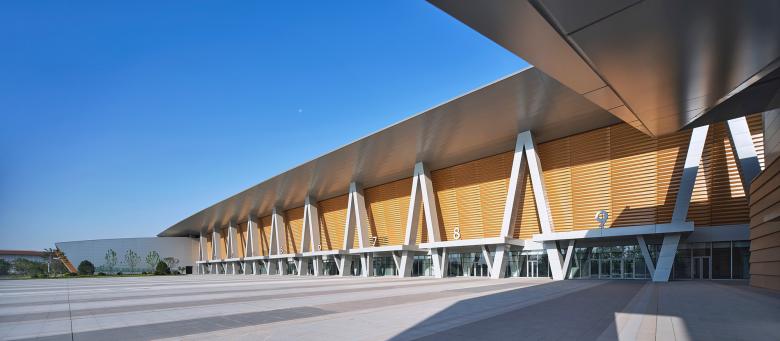 The largest hall in the trading center, Hall No. 1, covers an area of approximately 10,000 m2. Its column grid measures 75m (north-south) × 122.1m (east-west). The architecture features interconnected east-west curved roofs. Conventionally, bowstring beams are arranged along the curvature of the roof surfaces as the structural solution. In this design, main exhibition halls adopt an innovative top-supported steel bowstring arch truss system. This structural system successfully resolves three key challenges: out-of-plane instability of cable-braced systems, exposed HVAC duct at the roof, and structural support for the cantilevered roof profiles on both sides. The top-supported bowstring arch truss, in conjunction with the longitudinal curvature of the architectural roof, create an expressive interior space reminiscent of a hyperbolic dome. The central hall, serving as the core space for exhibition and trading, has a maximum height of approximately 23.7 meters. The design features vertically arranged V-shaped inclined columns on both sides of the central atrium, converging at the curved metal roof. The structural column arcade takes on a prominent role within the space. With the change of light and shadow in a day, the light shed by the roof skylight projected onto the arcade creates a flowing light and shadow, blending light, structure, and space into a harmonious unity.