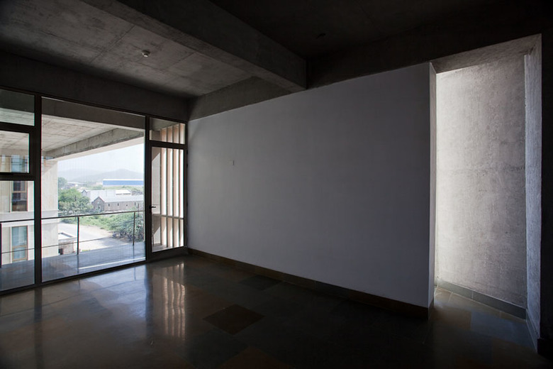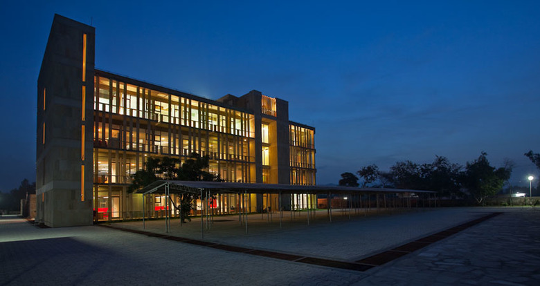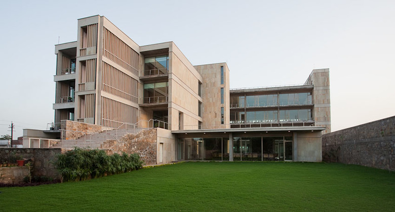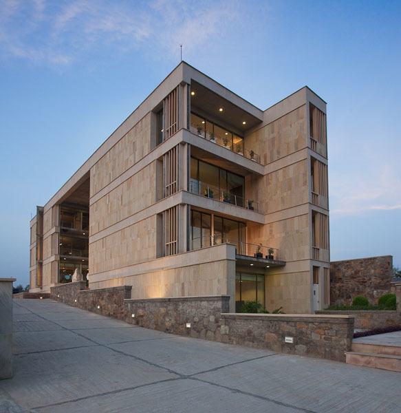 The design solution for the new office building for Wolkem India Ltd, in Udaipur – Rajasthan, emerged from simple principles – all employees must have direct access to natural light and ventilation, the materials used should require minimal maintenance, and the energy efficiency of the building should be maximized.