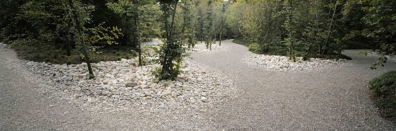 Auf den geologischen Karten von Basel wird eine Landschaft sichtbar, die in der heutigen Realität unter dichten Siedlungs- und Nutzungsstrukturen verborgen liegt: Die von Gletschern und Flüssen geformte Landschaft des Basler Rheintals. Von diesem natürlichen Untergrund ist der Boden des Campus Park durch eine Tiefgarage abgetrennt. Wie eine neue, menschgemachte geologische Kruste liegt sie unter dem Park, der – quasi als riesiger Dachgarten – die verborgene Landschaft des Rheintals in Form einer Komposition aus geomorphologischen und vegetativen Phänomenen des Rheintales nachzeichnet. Das Parkgelände fällt von den höherliegenden Terrassen bis zum Rheinufer hin ab. Wie in der natürlich entstandenen, umliegenden Landschaft der Rheinterrassen werden die Naturerscheinungen dieser Landschaft auf kleinem Massstab in ihrer natürlichen Abfolge nachempfunden und mit gestalterischen Mitteln zu einer atmosphärischen Parklandschaft zusammengefügt, die auch in der Pflanzenwahl auf die potentiell natürlichen Pflanzengesellschaften der Umgebung zurückgreift. In den oberen Parkteilen findet sich ein Wald aus heimischen Gehölzen, in dem riesige Findlinge als älteste glaziale Spuren zurückgeblieben zu sein scheinen. Tiefer im Wald ist das Bild in einem Moment der Zerstörung eingefroren: Wie in einem steilen Bergwald nach der jährlichen Schneeschmelze stehen hier Linden, die Stämme bis 60 cm tief im Geröll vergraben, scheinbar von der Wucht der Steine in Schräglage gebracht. Grosszügige Wiesenflächen formen den mittleren Parkteil, der mit einer abwechslungsreichen Vielfalt von mehrheitlich exotischen Solitärgehölzen bepflanzt ist. Tief eingeschnittene Hohlwege führen durch diese Wiesen in unteren Terrassen in Rheinnähe, ein von lichten Pappel- und Birkengruppen durchbrochenes Schwemmland mit Iris-Riedgraswiesen, wie sie für diese Landschaft typisch sind. So spannt sich zwischen den oberen Parkteilen und dem Rhein ein höchst künstliches Konstrukt auf: Der Park als Bühne der Natur.