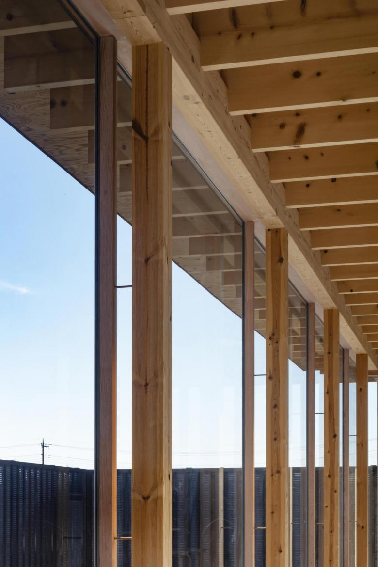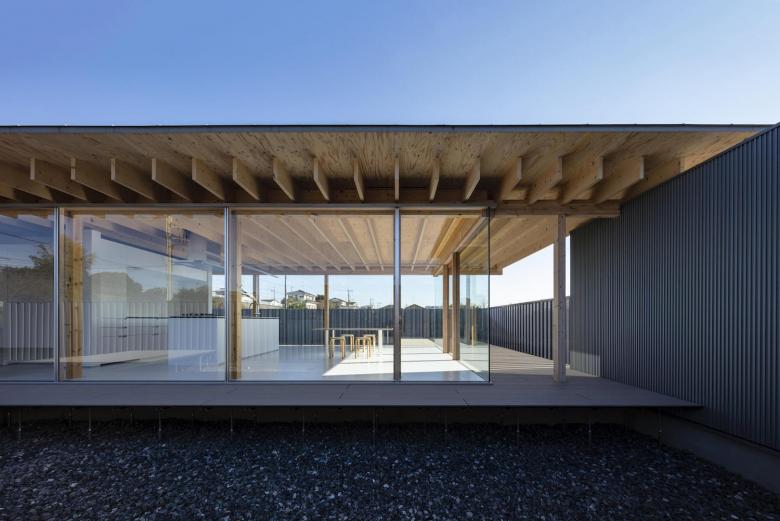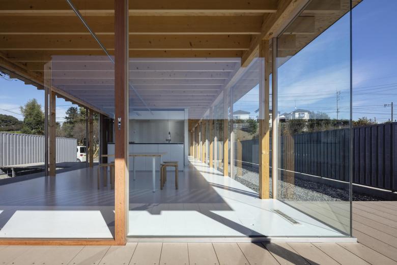 外周に視線を少しだけ透過する半透明の金属製の塀を設け、その内側の建物外壁は透明なガラスの壁とし、その中間の庭とも呼べない外部空間は将来の周辺環境の変化に対応するバッファー空間と考えることで、広い意味でのダブルスキンの外皮に包まれたオープンプランの建築を構想した。 構造は垂木を主構造部材とする木構造とし、それ以外の部材、外部デッキや塀などは可能な限り工場生産された既製部材を使用することで建築としての性能を確保すると同時に、木構造と工業製品が対比する内部風景をつくり出すことを考えていた。
