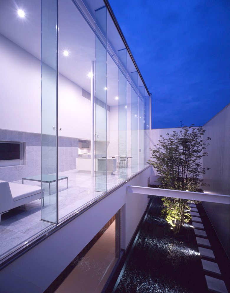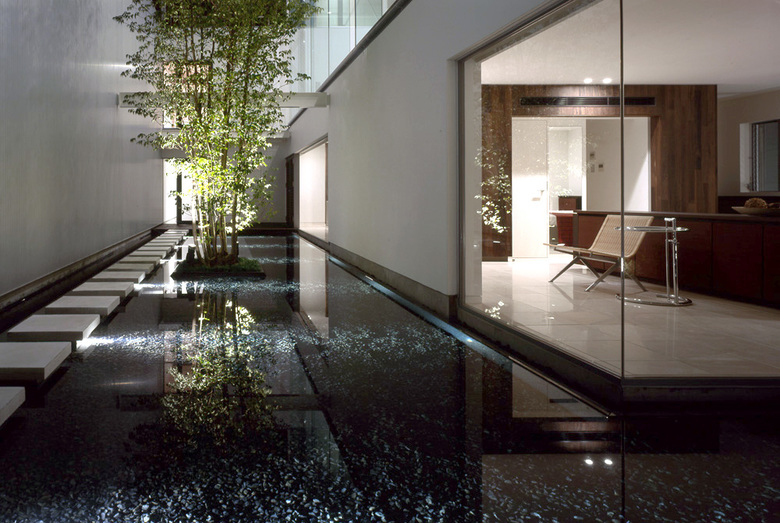 この住宅の中庭では「自然」をそれとは違った形で導入したいと考えた。そこにあるのは一本の樹と、抽象的な水平面としての水だけだ。飼い慣らされた自然である「坪庭」には我々は入ることが出来るが、この住宅にとっての「自然」