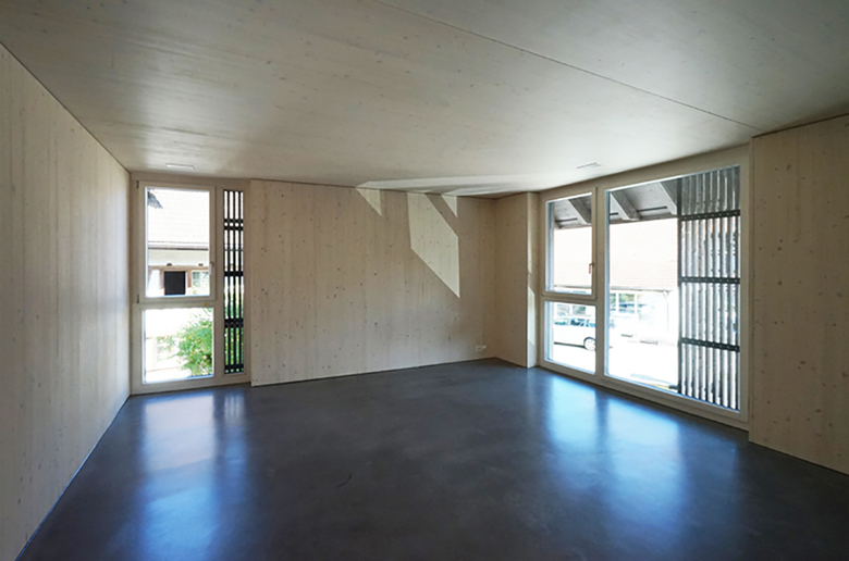 Der Ersatzneubau liegt mitten im historischen Dorfkern von Wangen. Das Projekt interpretiert die ortstypische Gebäudestruktur und entwickelt sie weiter: Die südwestliche Hälfte ist in Holz gebaut und übernimmt mit dem zweigeschossigen Wohnraum mit Galerie den Scheunencharakter sowohl im äusseren Erscheinungsbild als auch in der inneren Struktur. Der südöstliche Hausteil wird analog dem bestehenden Gebäude in Massivbauweise erstellt. Die Fassade des Holzbauteils besteht aus vertikalen Holzlamellen; diese befinden sich auch vor den Festverglasungen und lassen damit das Aussenlicht gefiltert in das Innere. Trotz den strengen denkmalpflegerischen Vorgaben entsteht ein grosszügiges Wohnen. Vor den grossflächigen Türen und Fenstern befinden sich Holztore bzw. - Läden in Anlehnung an die grossen Holztore des heutigen Scheunenteils.