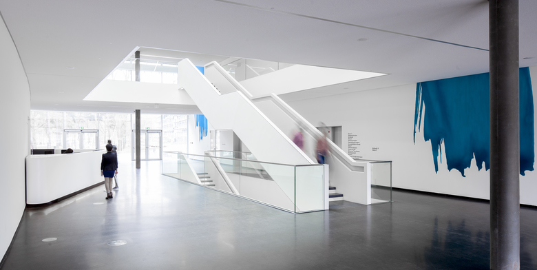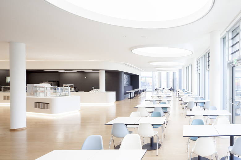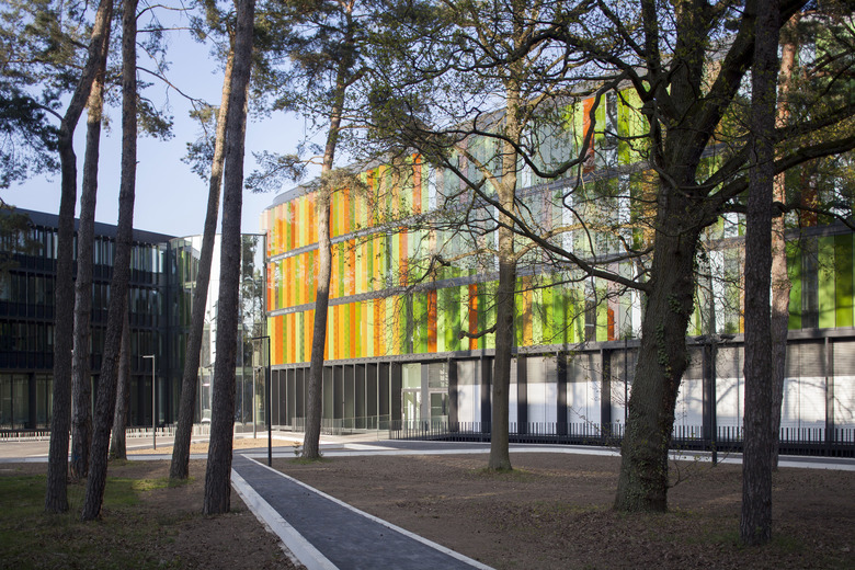 Prägendes Element des Ortes ist ein Kiefernwald. Trotz des großen Bauvolumens gehen die Gebäude darin auf – eine Folge der Ausformung der Baukörper und ihrer Fassadengestaltung. Obwohl die Arbeitsplätze bis zu 23 Meter von der Fassade entfernt liegen, ist die besondere Lage im Wald überall spürbar. Dazu trägt auch die prägnante Fassade aus Glaslamellen bei, die den Wald thematisiert, ihn hinein- und zurückspiegelt und mit den changierenden Farbtönen seine Laubfärbung aufnimmt, die sich mit den Jahreszeiten ändert.