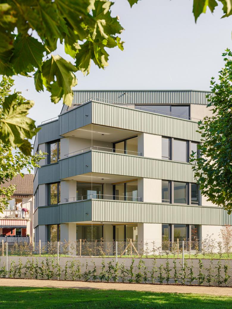 Der Abdruck des Gebäudes erinnert an einen Schmetterling. Seine Platzierung geht auf den vorhandenen Quartiercharakter ein und schreibt diesen zeitgemäss weiter. Diagonal gesetzte Wohnhäuser prägen die ortsbauliche Situation, die effektive Länge der Häuser ist dadurch schwer zu fassen. Immer wieder entstehen spannende Durchblicke zum Nachbarn. Ein direktes Gegenüber wird weitgehend vermieden.