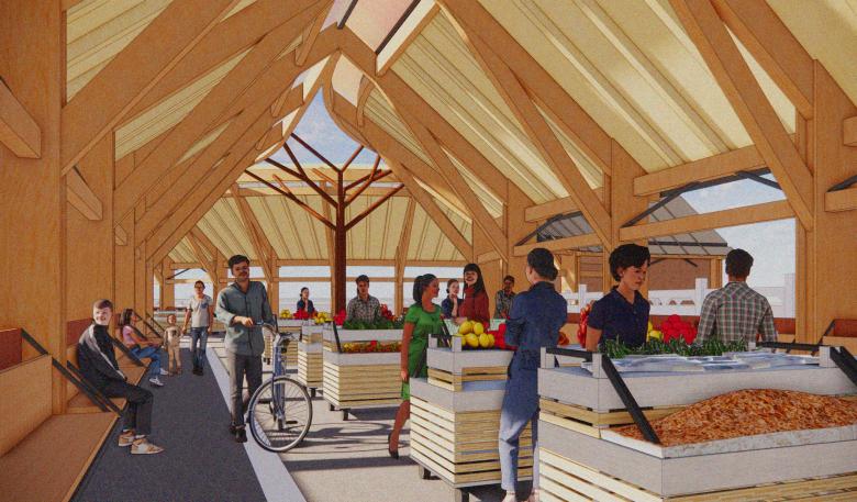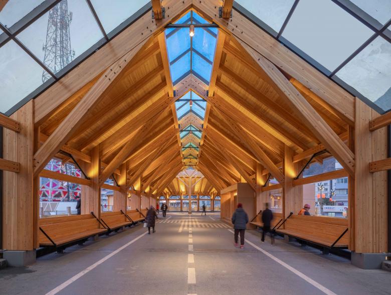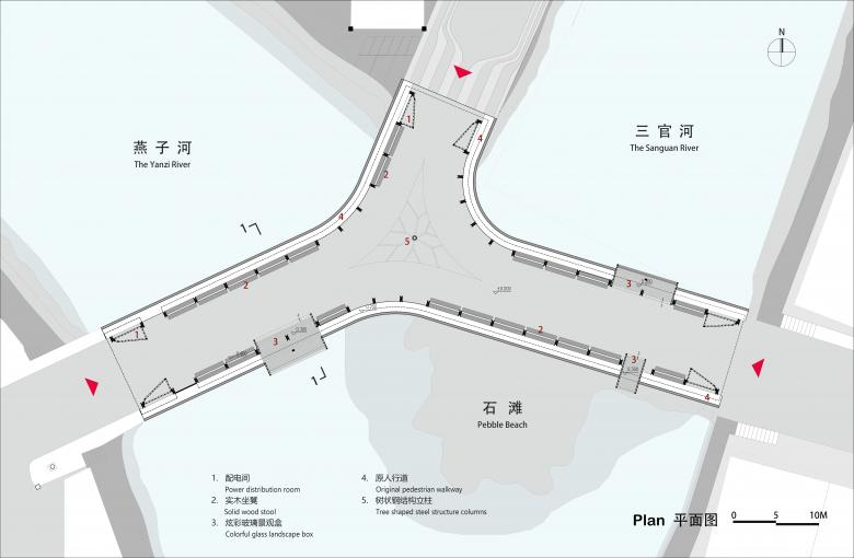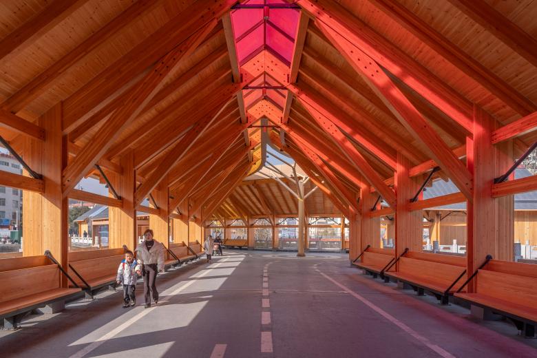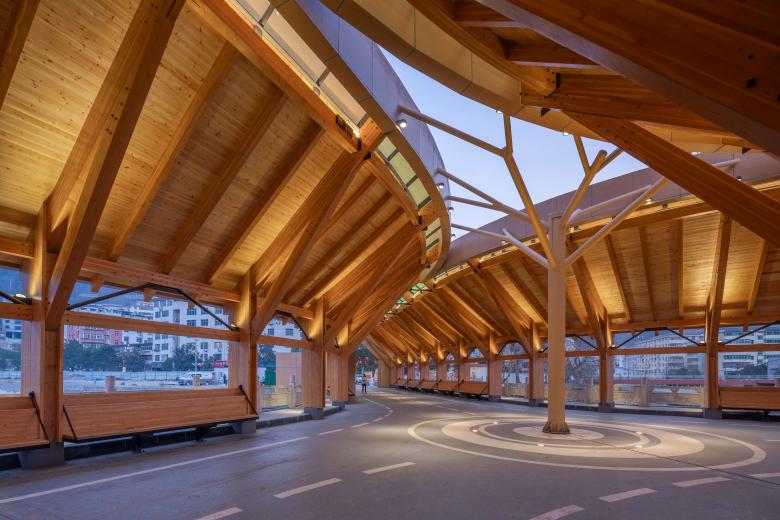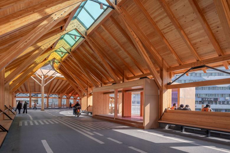 The project adheres to the principle of sustainability. The main structure of the original bridge has been retained, and the new building structure continues on the old bridge deck. The building is of timber structure, with the portal frames at the top of the slope as the main body, and slant support is applied to the columns on both sides. The main timbering is Douglas fir glued wood, which is prefabricated in the factory and installed on site, with a total carbon sequestration of about 144 tons. In addition, the white marble breast boards of the original bridge are retained for further use.