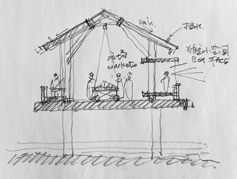 The layout of the corridor bridge follows the original bridge trend, with a width of 9m, the highest point of the roof of 7.2m, and a eaves height of 3.2m, which ensures the passage of fire trucks. The middle of the bridge is passable, also serving as a venue for temporary markets, outdoor performances, and other activities. The seats and independent box-shaped spaces are located on both sides of the bridge for leisure viewing.