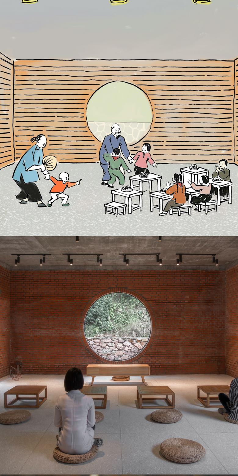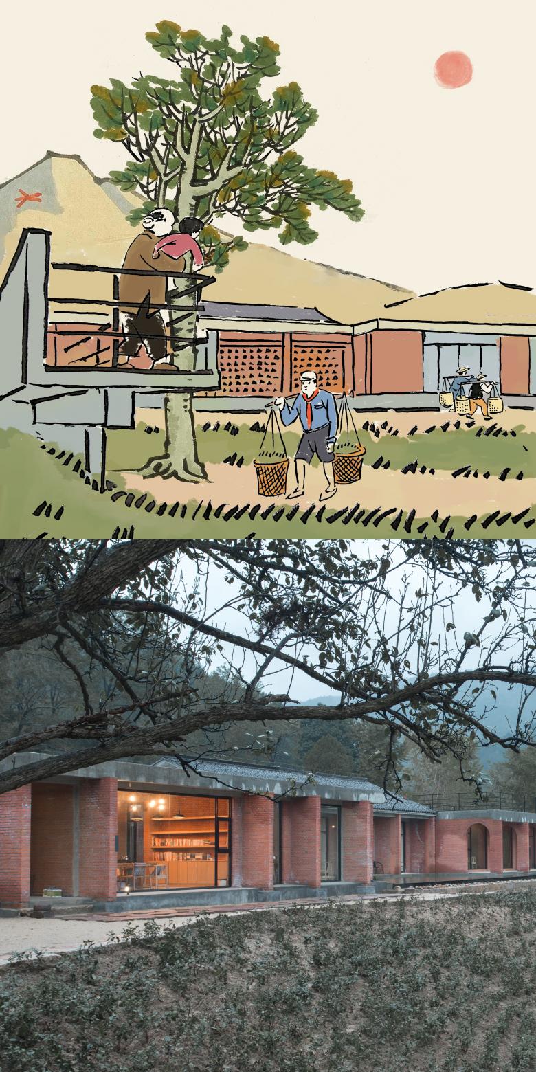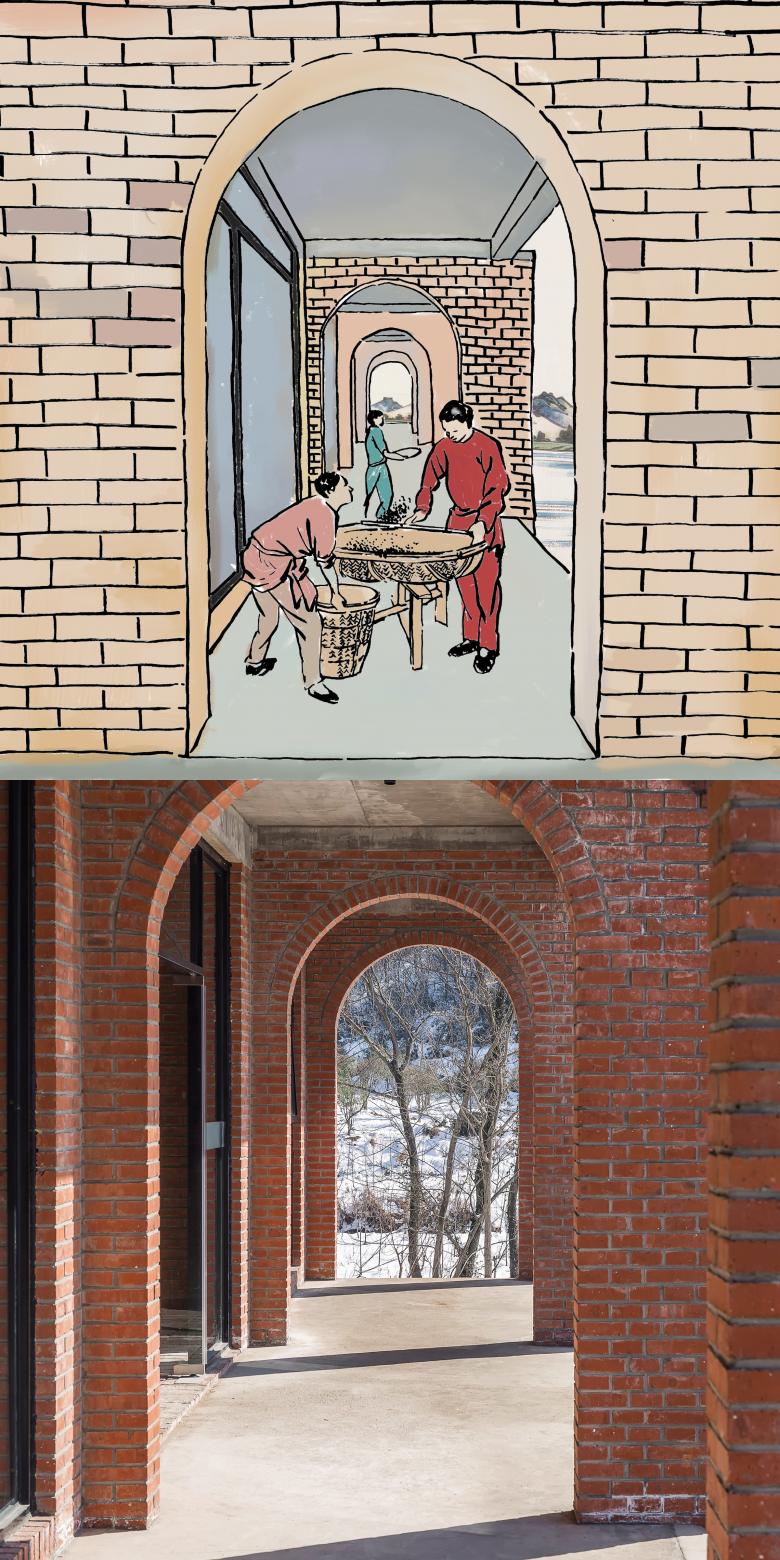 Because it is a new building, designers do not want to imitate the old houses, but want to give the building a sense of intimacy. The main materials of building is chosen the red brick commonly used in 1980s, the appearance of which does not aim for the consistency. On the contrary, the designer intends to mix different styles together, forming a sense of confusion. Because of this confusion, mix and match is attractive to rural buildings.