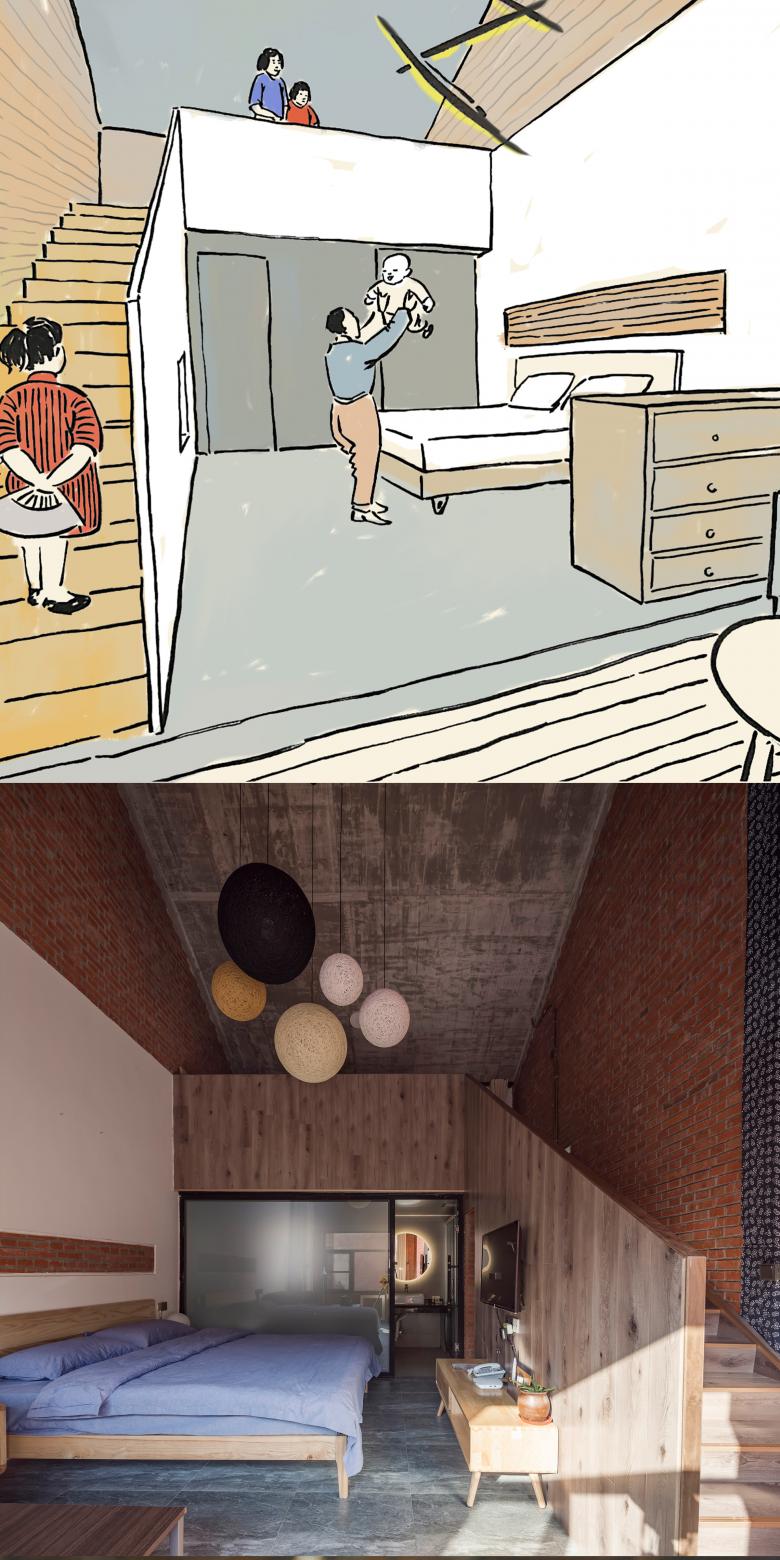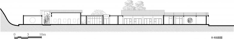 B Garden consists of a series of buildings in horizontal layouts due to space constraints. Designers have made a displacement of the blocks and have alternatively applied flat roofs and gable roofs (which have implied the position of original buildings.) The interlocking building blocks represent relief and casualness with zigzag outlines of plans and elevations.