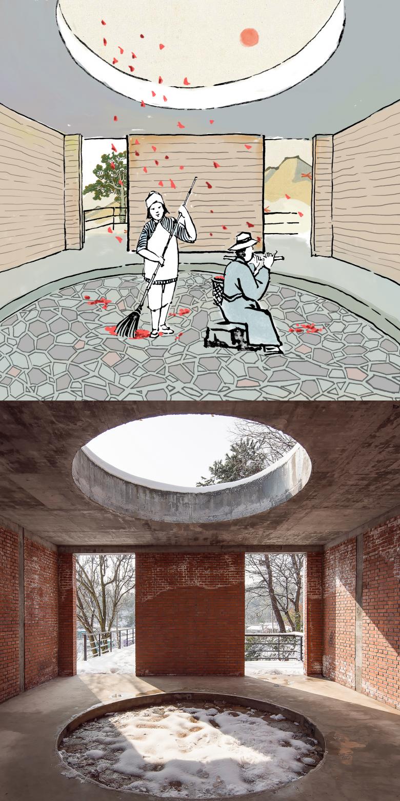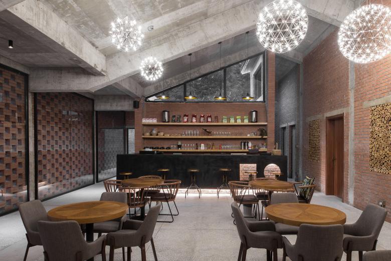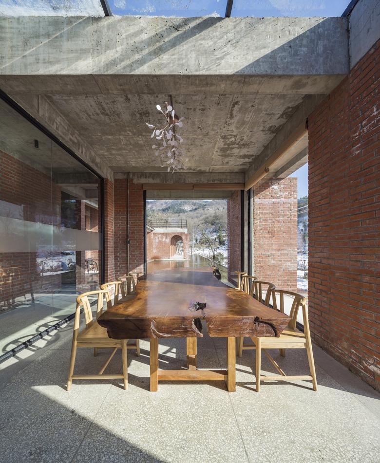 The interior of the building is not decorated, exposing material directly to form a controlled sense of rudeness. Terrazzo of the ground is exposed the structural components, further reinforcing this feeling. In the designer's view, such a process is in line with the name of the project - "Bieyuan" should be conveyed by a temperament, a special life different from the city.