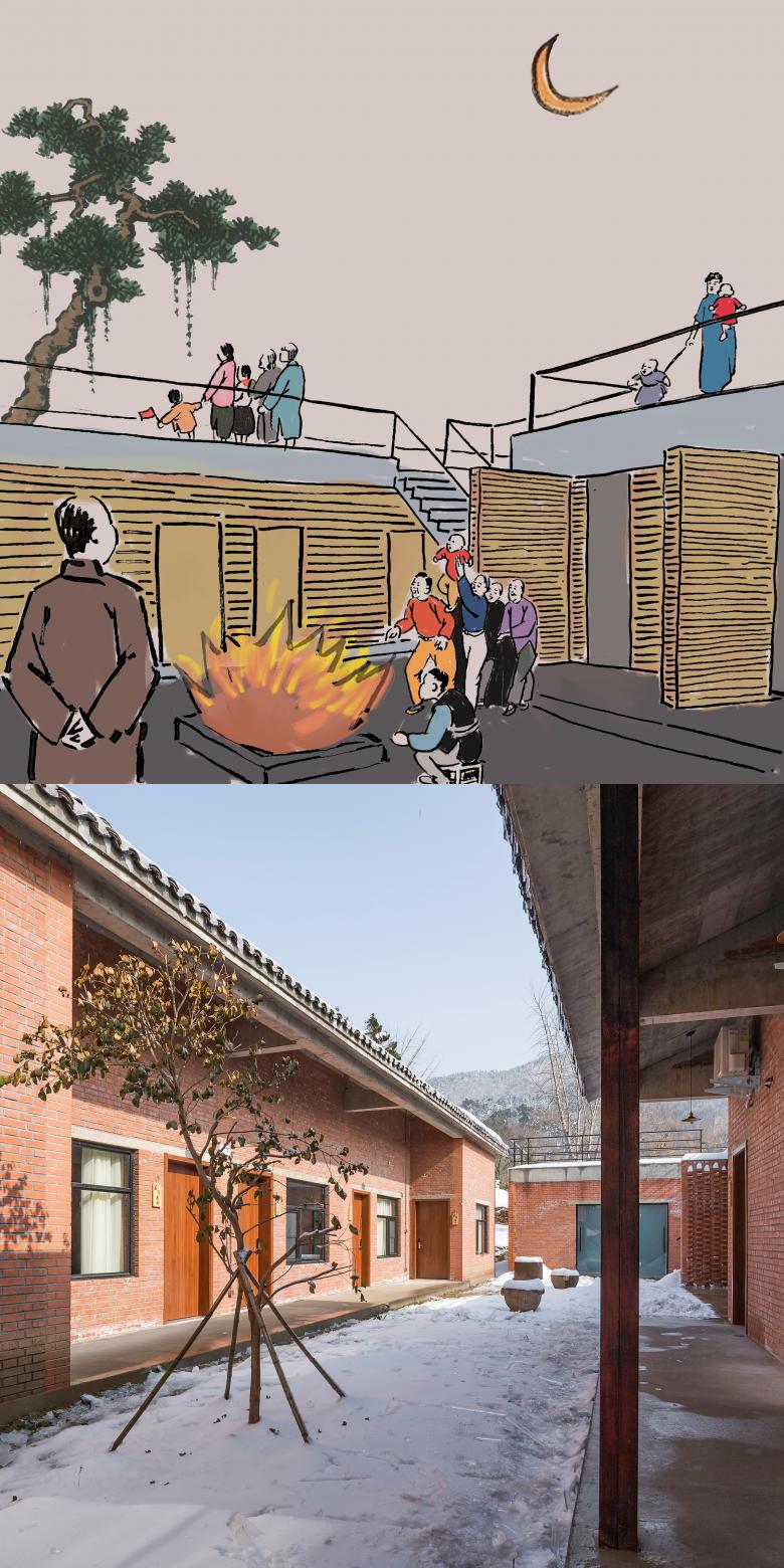 At the beginning, there was divergence between the owner and designers on the function of the new buildings. The owners initially intended to arrange as many guestrooms as possible, while the design team proposed more public functions to serve the campground. Through the analysis and discussion of the entire park, the two sides gradually reached a consensus: instead of a simple guesthouse or public service facilities, the new buildings will apply compound functions and formats, including guestrooms, a cafe, a teahouse, and an auditorium that can be used for public gathering and training programs, as well as a meditation space. All these functions are not isolated, instead, are intertwined and connected by multilayered and multidirectional traffic spaces.