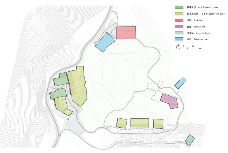新建筑的功能是民宿,而且是多个民宿品牌的集合。根据运营方的要求,一期建筑将包含两个民宿品牌,他们拥有独立的区域,服务不同的人群。两个民宿共用一系列公共空间,包括:书吧、室外游泳池和餐厅等。