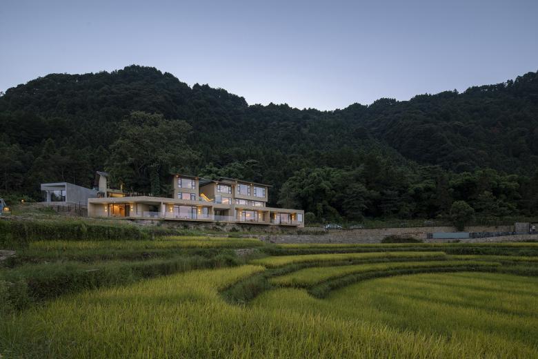 The building is selected to be built on the edge of the paddy field. In order not to damage the overall landscape of the paddy field, the architect uses the elevation difference of the terrain to bury the building underground and hide it in the paddy field. The architectural form should be as simple as possible, and the plane should be in the form of broken line, which should be buckled into the site. Single slope top, concrete structure and floor-to-ceiling glass windows of the facade facing the cliff mouth keep the indoor and outdoor transparency of the building. The roof adopts counter beams, and the indoor ceiling is kept level. Instead of using conventional roof treatment, rice is planted in soilless culture on the roof and, meanwhile, the counter beams become the partition to keep the water surface. The rice on the roof is integrated with the paddy field around the building, which makes the building invisible and gives the building distinct personality.