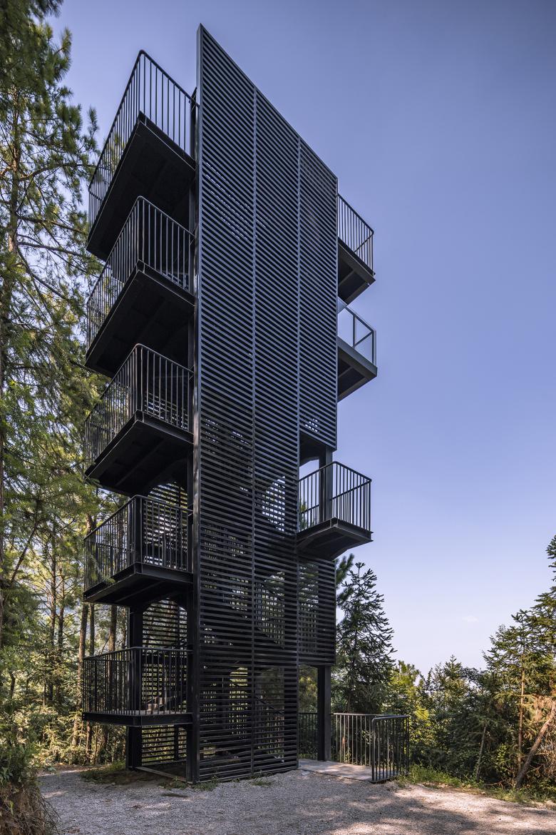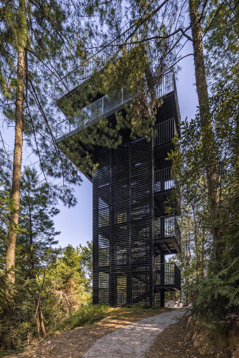 The guest rooms and reception area are located at the foot of the mountain on the west and south sides, and try not to occupy the land on the premise of having a good view. The original road in the site was moved westward, passing between the new building and the mountain forest behind it, so that the traffic between the new building and the paddy field is not disturbed, which is also convenient for the closed management in the later operation. The book bar and the outdoor swimming pool are arranged together, located on the north side of the paddy field, with the forest behind as the backing. The restaurant is located in the east of the site. It is the only building built in the paddy field, yet buried in the middle of the paddy field. In the southeast corner of the core area of the site, a watchtower is also built, which can be used not only for climbing and sightseeing, but also for forest fire prevention.