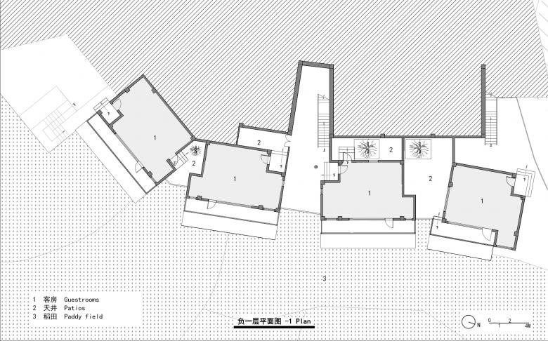 客房分为两个区域,分别对应两个不同的民宿品牌——飞茑集和元白。飞茑集位于场地原宅基地(原建筑因质量问题被拆除)位置上,面向稻田和山的豁口,具有最好的观景面。客房共三层,12间,入口层和二层采用背廊式布局,保证了客房都面向稻田。负一层并不是地下,而是利用场地原有高差形成的错层。负一层和入口层在剖面上错开,负一层的屋顶正好成为入口层的室外平台。这里建筑师除了阳台外,还设计了一个联通的浅水池,在为客房提供舒适小环境的同时,也增加了室外活动的趣味性和建筑的视觉性。错层的处理也使建筑在视觉上分为两段,弱化了建筑总高三层给人的压迫感。飞茑集客房南侧有一棵老树,它携带了原场地的场所记忆。建筑师刻意保留了老树,建筑邻树而建,形成了一种共生关系。树下利用木平台与负一层的屋顶浅水池相连,成为户外休闲的场地。